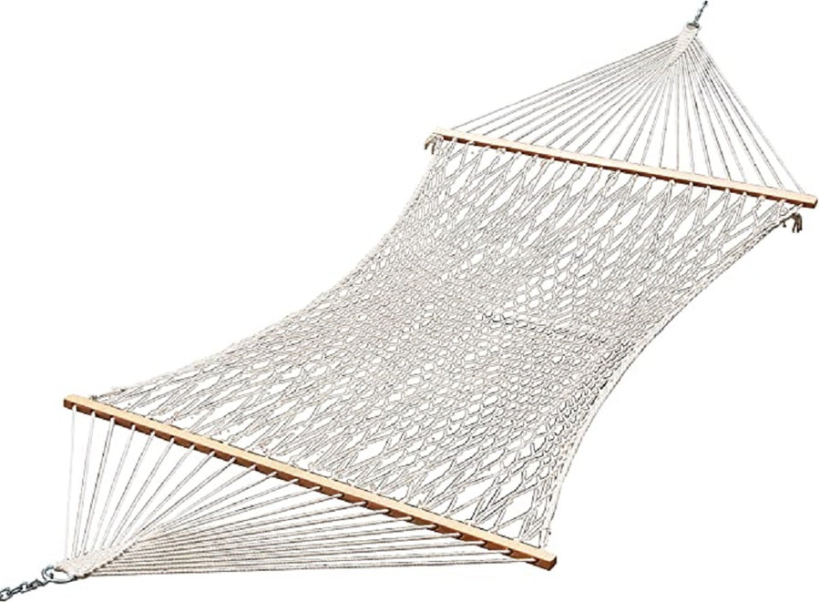 The Bahia outdoor hammock adds comfort to the quality time that you spend outdoors. This versatile double hammock for outside can accent your patio furniture, add more comfort to your backyard, or be your go-to lounge spot on the porch. Bring it along while traveling and relax near the campfire with this comfortable tree hammock. This rope hammock has hardwood spreader bars and zinc plated rings.