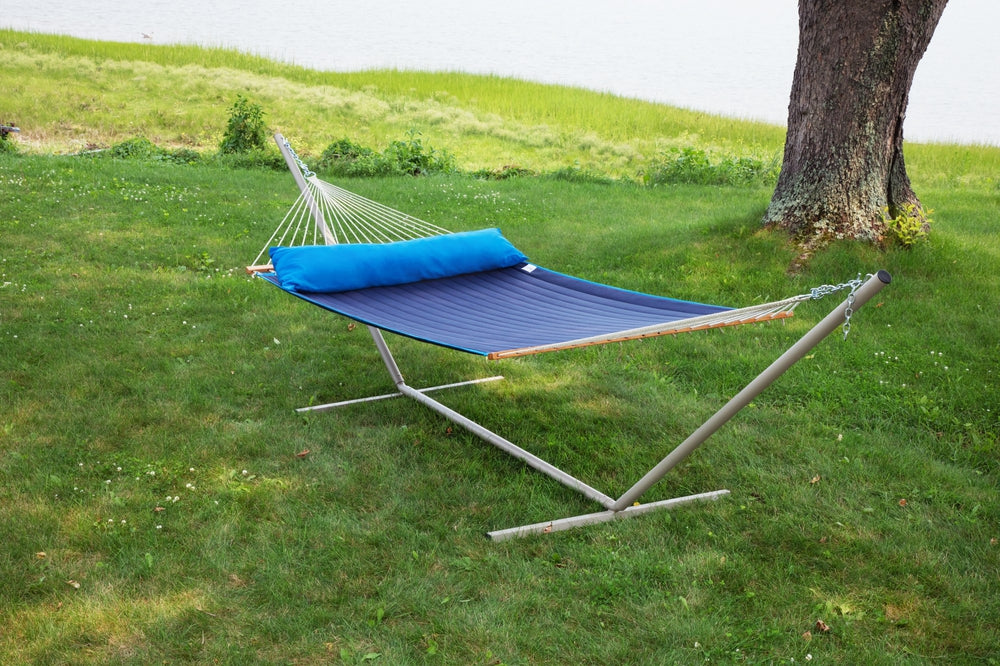 By using an outdoor hammock stand, you can add comfort to the quality time that you spend outdoors. This versatile double hammock stand for outside can accent your patio furniture, add more comfort to your backyard, or be your go-to lounge spot on the porch. The durable patio swing frame has been crafted with 12 gauge steel piping, and will add a bit of luxury to your life. Take a moment to enjoy the simpler things in life while you sit back and relax on this 13.5 foot metal hammock stand, made with no-tool spring pin assembly, a shielded powder coating, and angled offset hooks.