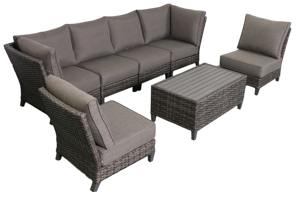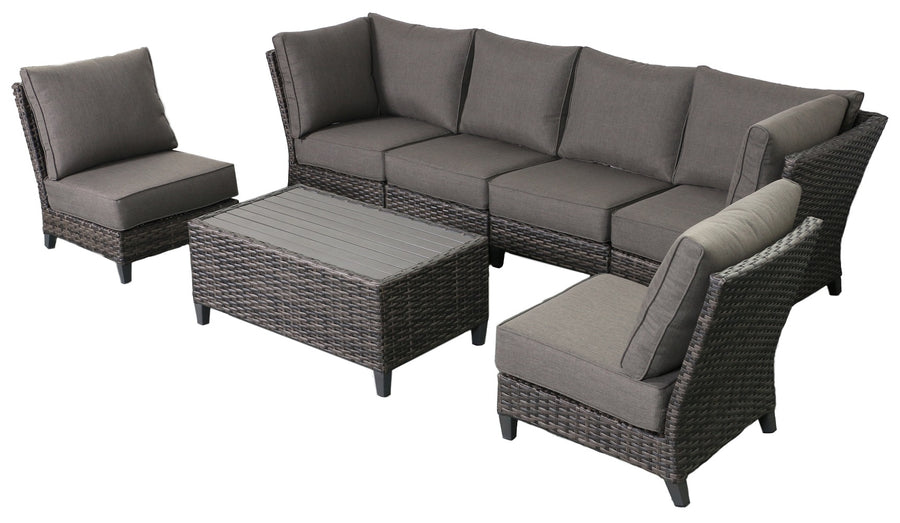 Endlessly manueverable, The Barbados sectional set offers a variety of options and layouts for any outdoor area. Made of high quality wicker with an aluminum frame and Sunbrella cushions this is the perfect addition to your outdoor living area. The durable patio sectional with seating for six will revitalize your backyard and garden and become your loved ones favorite place to sit back and relax. The water resistant, mold resistant and fade resistant material allow this piece to remain bright and colorful all year around. It is important to keep the outdoor cushions from being exposed to heavy rain or snow when possible. Put your guests in awe with this outdoor lawn furniture like they have never seen before.
