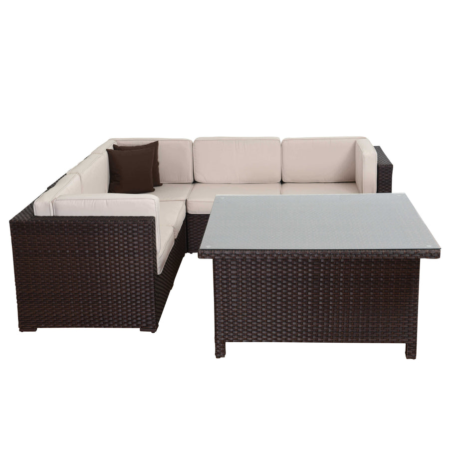 Enjoy a relaxing evening outdoors with friends and family with the Atlantic Bellagio 7 piece outdoor conversation set. This outdoor patio furniture set is made from brown wicker, and includes two corner pieces, two middle pieces, two ottomans, and one tempered glass top table. Assembly is required only for the table.