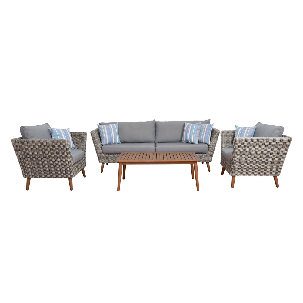 The Amazonia Boston 4 piece outdoor seating patio conversation set will transform your backyard into a relaxing social spot! This modern furniture seating set includes one coffee table, one two armchairs and one outdoor wicker sofa. Seat cushions are included. Assembly is required.