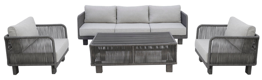 This Cancun outdoor patio furniture sofa set comes with two club chairs, one sofa, a coffee table, and light grey olefin cushions making it the perfect addition to your outdoor living area. The durable accent chair and sofa set will revitalize your backyard and garden and become your loved ones favorite place to sit back and relax. The water resistant, mold resistant and fade resistant material allow this piece to remain bright and colorful all year around. It is important to keep the arm chair and outdoor cushions from being exposed to heavy rain or snow when possible. Put your guests in awe with this outdoor club chair like they have never seen before.