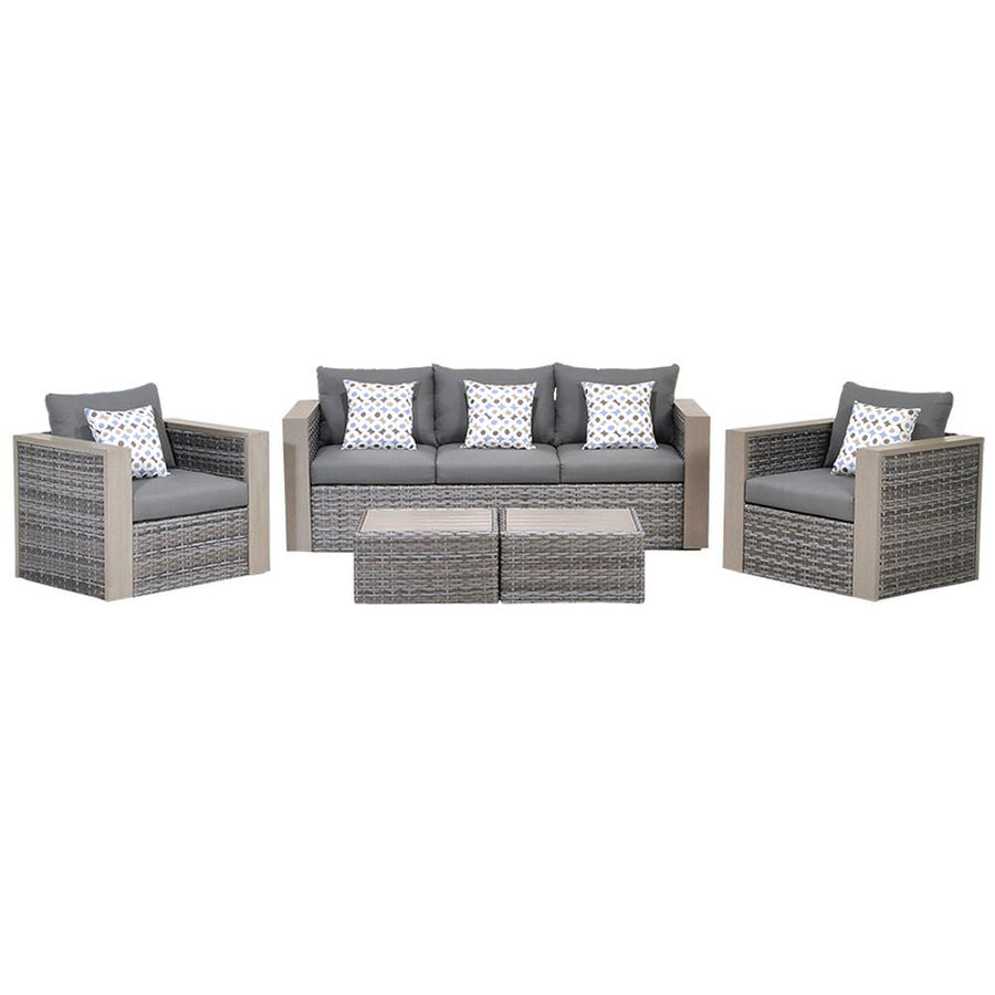 Add this high quality, stylish outdoor patio set, made of aluminum and synthetic wicker to your outdoor backyard furniture. This conversation set comes equipped with one sofa, two armchairs, and two coffee tables. Enjoy your patio with elegance all year round with the wonderful Atlantic outdoor collection. Assembly only required for sofa seat.
