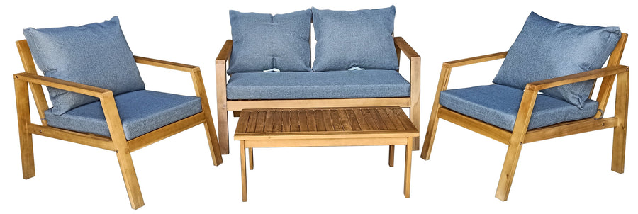 Endlessly manueverable, The Fiji sectional 4 piece set offers a variety of options and layouts for any outdoor area. Made of high qualiy Wood with blue Olefin cushions this is the perfect addition to your outdoor living area. The durable patio sectional with seating for five will revitalize your backyard and garden and become your loved ones favorite place to sit back and relax. The water resistant, mold resistant and fade resistant material allow this piece to remain bright and colorful all year around. It is important to keep the outdoor cushions from being exposed to heavy rain or snow when possible. Put your guests in awe with this outdoor lawn furniture like they have never seen before.