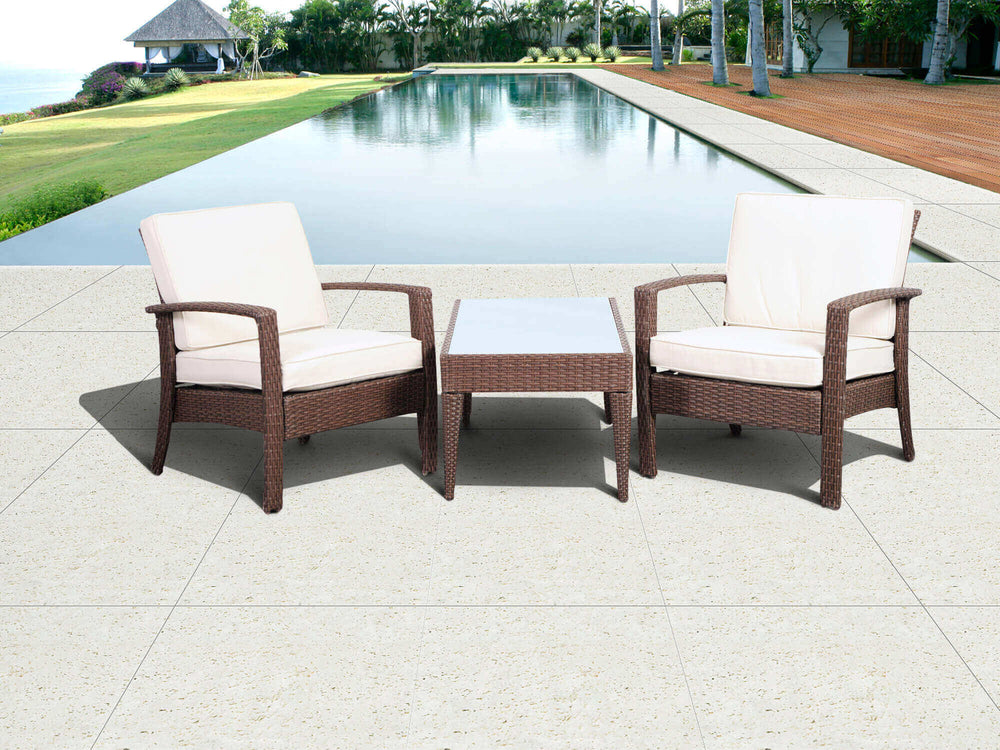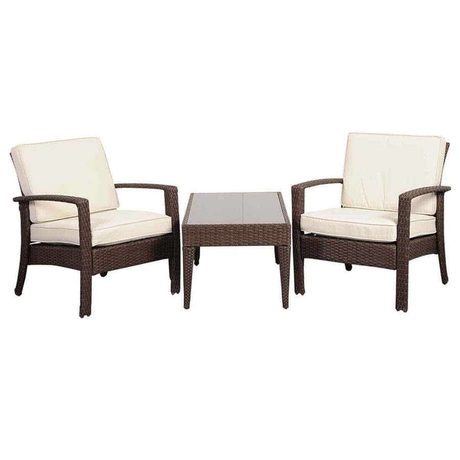 Enjoy a morning coffee as you relax on the Florida deluxe 3 piece wicker patio conversation set. This modern and sylish outdoor conversation set is made from high quality brown wicker and includes two armchairs and one coffee table. Seat cushions are included for additional comfort. Assembly is required.