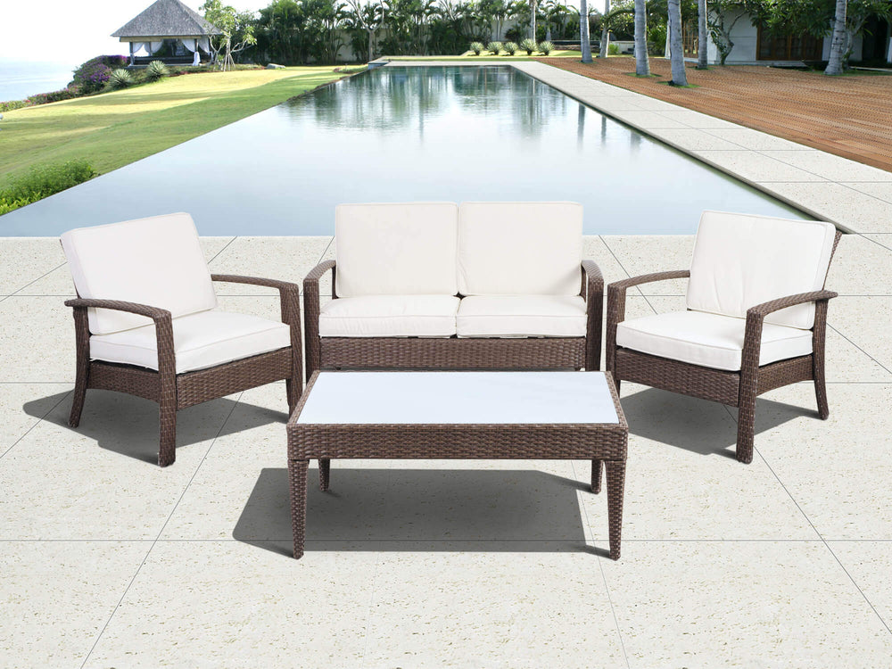 Enjoy a relaxing night with friends and family with the trendy Florida deluxe 4 piece wicker patio conversation set. This modern conversation set is made from brown wicker and includes two armchairs, one loveseat, and one coffee table with tempered glass top. Seat cushions are included for additional comfort. Assembly is required.