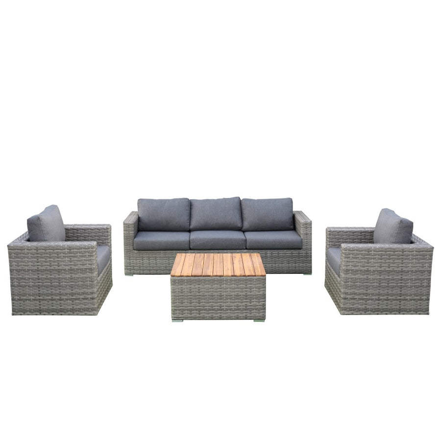 The Miami outdoor patio furniture set for five with olefin grey cushions and a coffee table is the perfect addition to your outdoor living area. The 4-piece patio seating set will revitalize your backyard and patio lounge area. The durable material allows this outdoor wicker furniture set to remain bright and colorful all year round. Put your guests in awe with this conversation set outdoor furniture, they will enjoy every minute they are in your backyard. Create a cozy outdoor lounging space in your backyard with this ultra-comfortable and stylish patio set. Rearrange this sectional sofa set in different areas of your patio to fit into many layouts or suit any style. A patio furniture sectional perfect for your patio, porch, backyard, balcony, poolside, and garden. The true beauty of this outdoor wicker furniture set is that its resin wicker build combines ease of use with durability. For longer use, it is important to keep the outdoor cushions from being over exposed to heavy rain or snow when possible. Our outdoor patio furniture conversation sets are designed with form and function in mind to help you create the outdoor space in your backyard you have always dreamt of! Assembly required.