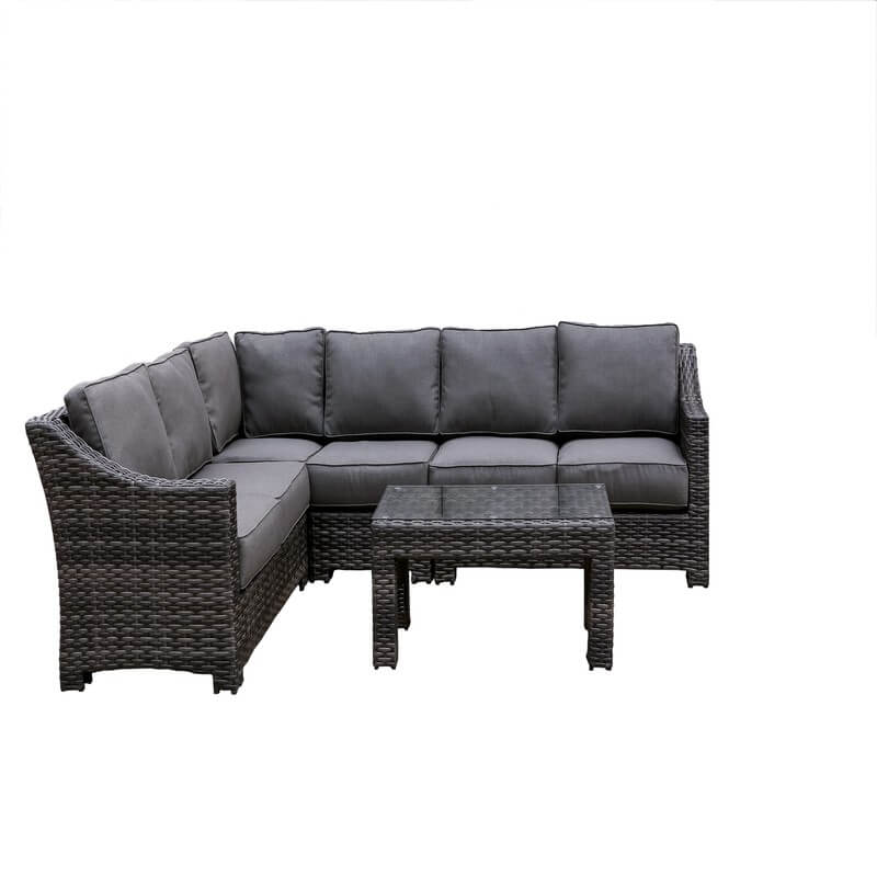 The Bora Bora outdoor patio furniture full sectional sofa with charcoal grey olefin cushions are the perfect addition to your outdoor living area. The durable patio sectional with seating will revitalize your backyard and garden and become your loved ones favorite place to sit back and relax. The water resistant, mold resistant and fade resistant material allow this piece to remain bright and colorful all year around. It is important to keep the outdoor cushions from being exposed to heavy rain or snow when possible. Put your guests in awe with this outdoor lawn furniture like they have never seen before.