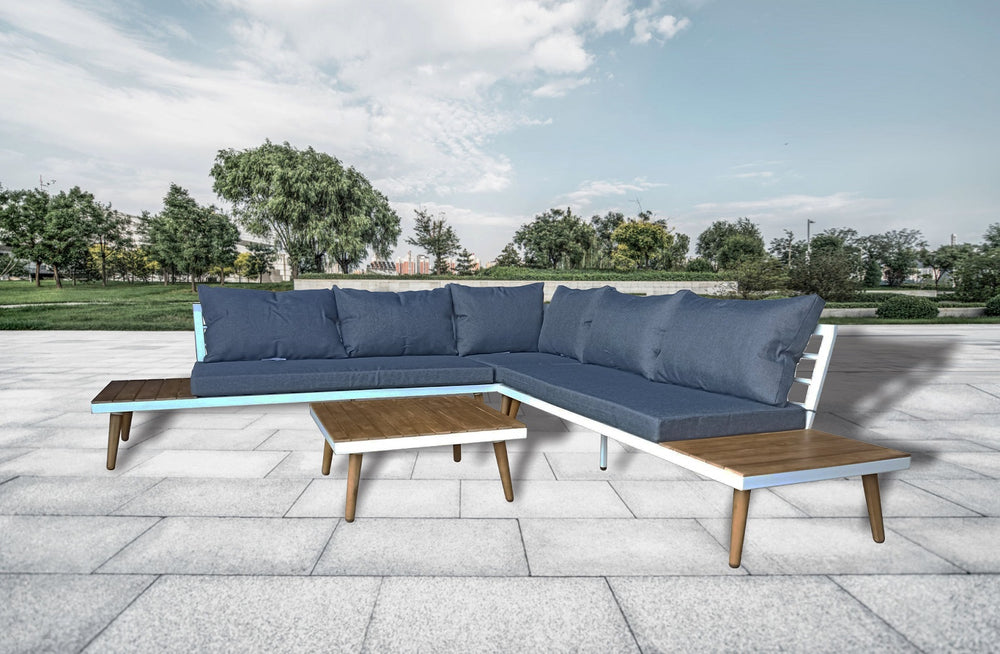 Endlessly manueverable, The Paradise sectional 3 piece set offers a variety of options and layouts for any outdoor area. Made of durable Wood with blue Olefin cushions, this is the perfect addition to your outdoor living area. The durable patio sectional seating will revitalize your backyard and garden and become your loved ones favorite place to sit back and relax. The water resistant, mold resistant and fade resistant material allow this piece to remain bright and colorful all year around. It is important to keep the outdoor cushions from being exposed to heavy rain or snow when possible. Put your guests in awe with this outdoor lawn furniture like they have never seen before.