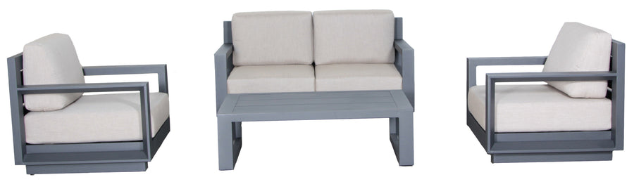 The Paris outdoor patio furniture love seat set with one love seat, two club chairs and one coffee table with beige Sunbrella cushions are the perfect addition to your outdoor living area. The durable accent chairs with durable Aluminum finish and comfortable seating will revitalize your backyard and garden. This will become your loved ones favorite place to sit back and relax! The water resistant, mold resistant and fade resistant material allow this piece to remain bright and colorful all year around. It is important to keep the loveseat set arm chairs and outdoor cushions from being exposed to heavy rain or snow when possible. Put your guests in awe with this outdoor lawn loveseat like they have never seen before.