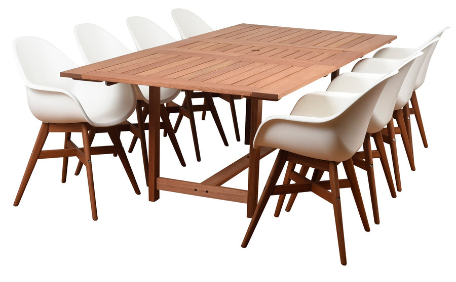 Amazonia Charlotte 9 piece Deluxe Eucalyptus Extendable Rectangular Dining Set brightens up your patio or deck with a wood table and white chairs. The natural eucalyptus wood is perfect match for every patio and will give your backyard the class and elegance for outdoor dining. The white resin chairs complement the natural brown eucalyptus table enhancing the beauty of your outdoor area. This collection combines luxury, beauty, comfort, and an affordable price. The set is made of solid Eucalyptus wood, grown in 100% well managed forests in Brazil and it is certified by the FSC (Forest Stewardship Council). This contemporary set is primarily designed for outdoor purposes but can also be used indoors giving your home a modern touch. Durable and well-designed construction are key components of this great patio set. The dining set comes with a complementary preservative oil for the wood to keep it looking brand new. This 9 pc dining set seats 8 people and includes an extendable rectangular table with 8 armchairs.