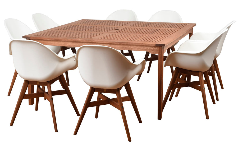 The Amazonia Charlotte 9 piece dining set enhances the beauty of any outdoor area with the carefully crafted modern design. The brown eucalyptus dining table complements the white aluminum chairs for a simple, modern look. This set combines luxury, beauty, comfort, and an affordable price. This lightweight aluminium furniture is made from the highest quality alloys and is based on a framework of only new aluminium which maintains the original quality of the material. This contemporary set is primarily designed for outdoor purposes but can also be used indoors giving your home a modern touch. Durable and well-designed construction is key components of this great patio set. The aluminum chairs are coated making them rust and able to withstand all weather conditions. The dining table is crafted from premium eucalyptus wood. The 9 piece set includes 1 square eucalyptus table and 8 armchairs.