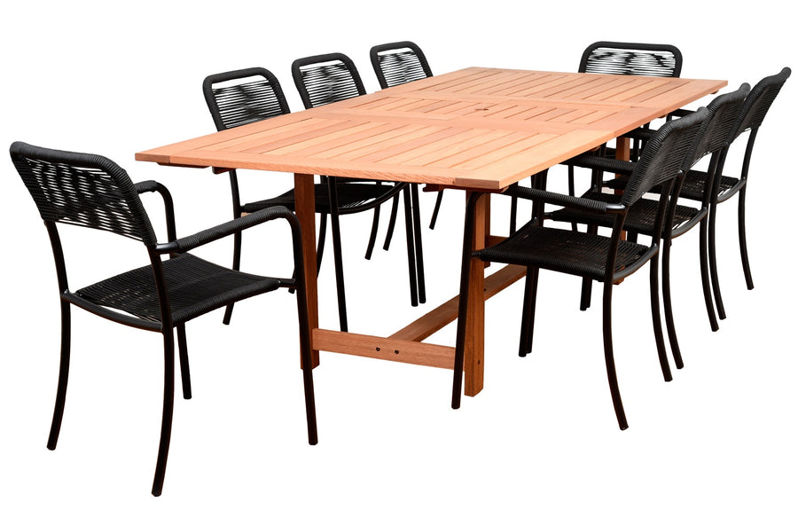 Amazonia Oosterdam 9 piece Eucalyptus Extendable Rectangular Dining Set brightens up your patio or deck with a wood table and black aluminum chairs. The natural eucalyptus wood is perfect match for every patio and will give your backyard the class and elegance for outdoor dining. This chair is made of aluminum and rope. This lightweight aluminium furniture is made from the highest quality alloys and coated with Duracoat to make them weather resistant.This collection combines luxury, beauty, comfort, and an affordable price. The set is made of solid Eucalyptus wood, grown in 100% well managed forests in Brazil and it is certified by the FSC (Forest Stewardship Council). This contemporary set is primarily designed for outdoor purposes but can also be used indoors giving your home a modern touch. Durable and well-designed construction are key components of this great patio set. The dining set comes with a complementary preservative oil for the wood to keep it looking brand new. This 9 pc dining set seats 8 people and includes an extendable rectangular table with 8 armchairs.