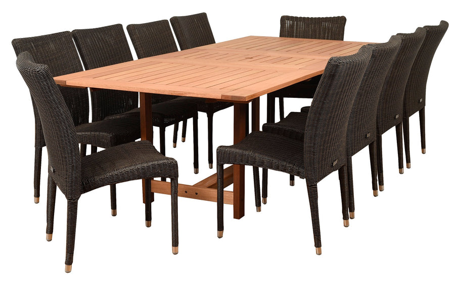The Amazonia Catania 11 piece dining set adds a contemporary appeal to any outdoor area with the carefully crafted modern design. The brown eucalyptus dining table complements the distressed gray wicker chairs for a simple, modern look. This set combines luxury, beauty, comfort, and an affordable price. The eucalyptus wood is FSC certified and of the utmost quality. The chairs are constructed with high quality, resin wicker with rust-free aluminum frames with hardware made of galvanized steel. This stylish set is primarily designed for outdoor purposes but can also be used indoors giving your home a modern touch. Durable and well-designed construction are key components of this great patio set. The eucalyptus and wicker are coated to withstand all weather conditions. The 11 piece set includes 1 extendable rectangular eucalyptus table and 10 stacking armchairs.